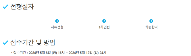 채용 절차: 서류 전형 > 인적성 검사 > 면접 전형 > 최종 합격
